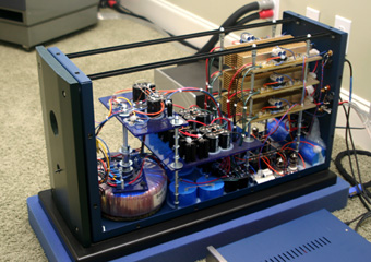 The 118-pound BC206 is a hybrid, fully balanced design that produces 180Wpc into 8 ohms and 360Wpc into 4. The hybrid designation is due to a tube input stage, with the output stage being pure solid state. It is a vertically oriented amplifier, taller than it is wide and very deep (13"W x 18 1/8"H x 31 3/4"D). According to Gilbert this arrangement makes it efficient at dissipating heat. As previously mentioned, the base and faceplate are MDF, but the chassis is 12-gauge steel. The one-piece damped top/side piece pulls off like a shroud, revealing the complex-looking inner workings. Front and center is a 1300VA transformer that appears huge for its rating. A discussion of how transformer makers rate their devices ensued once I commented on this, and Gilbert confided that other manufacturers might rate his 1300VA unit at 2000VA. Looking at the size alone, Id say hes probably correct, and this goes a long way toward illustrating his no-nonsense, no-BS approach to audio and business. The supply capacitance is specified at 375,000 microfarads, with each capacitor sitting in a bed of silicone for damping. The output stage is located on three tiers above the ground floor, with each tier suspended on metal rods. About 95% of the interior construction is point-to-point wired. Youll see no massive circuit boards stuffed with parts. This is obviously a labor-intensive product to build, but then all Blue Circle products follow this methodology to some degree. The rear-panel facilities consist of dual sets of heavy-duty binding posts, balanced and single-ended inputs, and, most usefully, a ground-lift switch that disconnects the signal ground (the chassis is still grounded for safety purposes). If youve ever experienced a pesky ground-loop hum, youll know how useful this switch can be. Rounding out the backside is a 20A Neutrik Power Con connector for AC connection. A hefty 10AWG BC62 power cord is included with the BC206. The BC3000 Mk II is a direct descendant of the original BC3 preamplifier. Its currently available in several different iterations, with differences being in the actual circuitry as well as the complexity of the power supply. The BC3 Despina Mk II ($3495) is the entry-level unit in the line, but it is upgradeable to the model under consideration here. The BC3000 Mk II I received is the top model in the range. The main chassis is 17 1/2"W x 3 1/4"H x 14 1/2"D and weighs 37 pounds. Thats quite substantial when you consider that the power supply (designated the BCG3.1 Mk II) is housed in a separate chassis (6"W x 5 3/8"H x 14 1/2"D, 16 pounds). The review sample came supplied as a fully balanced, dual-mono version sporting three sets of XLR-equipped inputs, two sets of XLR outputs, and a single tape loop also on XLRs.